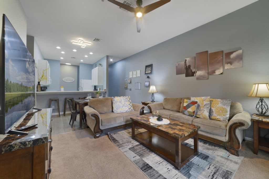 Living Room features a large, 55” Smart TV and comfy sofas!