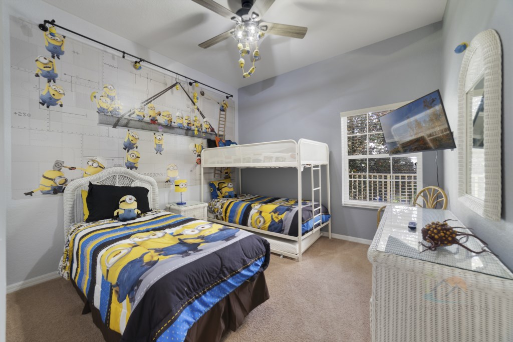 Bunk Bed (twin/single) with an additional single (twin) bed for a total of 3, wall-mounted 32” TV with cable and a dresser and closet. Extra bed available as well, for a total of 4 spaces!